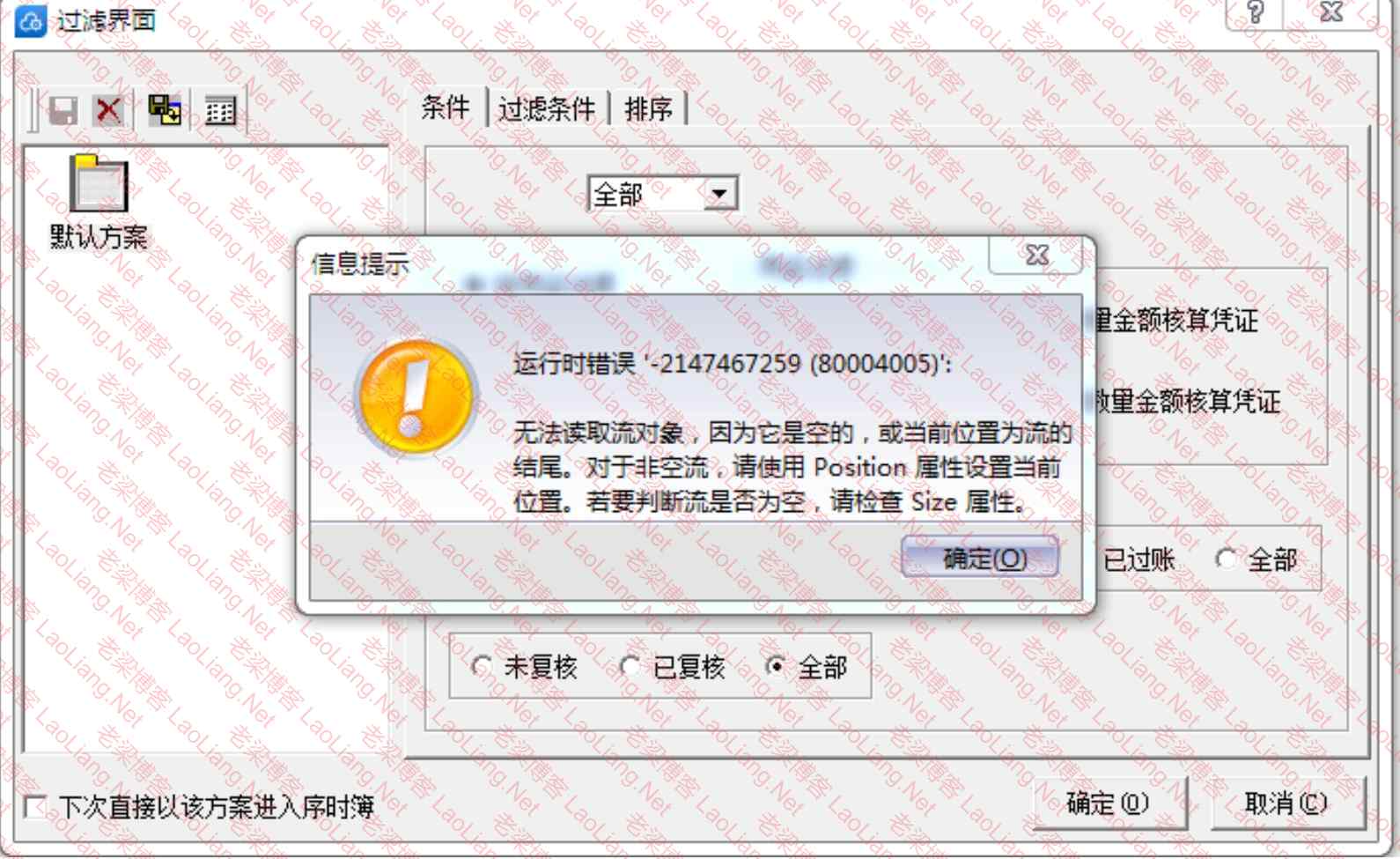 老梁(蛤蟆哥)金蝶软件金蝶kis专业版16.0打开凭证管理或进入序时簿提示“运行时错误 '-2147467259(80004005)'无法读取流对象,因为它是空的,或当前位置为流的结尾”的说明 今天一早有网友找到我说,他家的金蝶kis专业版16.0在进入凭证序时簿查询的时候提示...