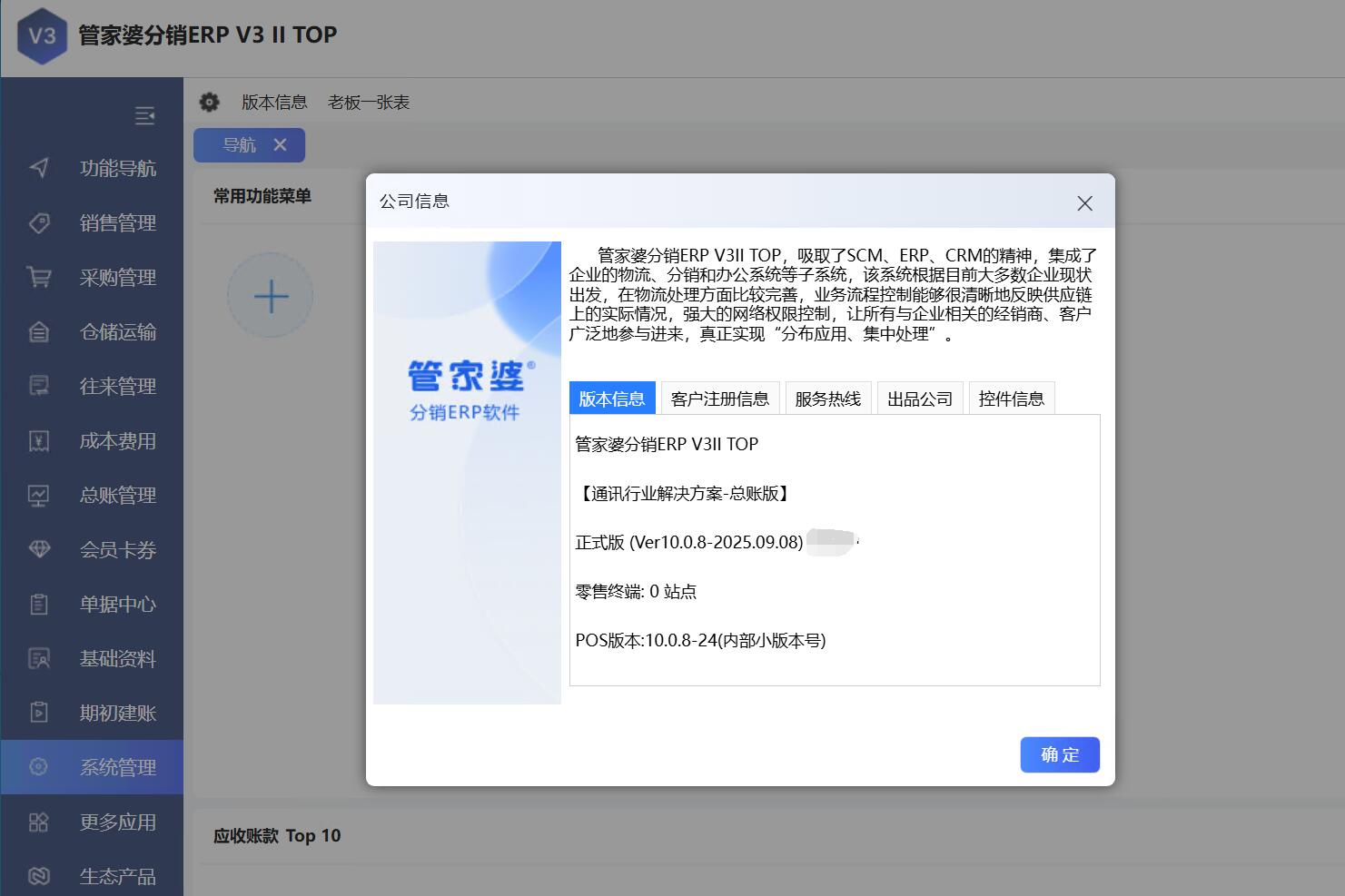 管家婆分销ERP V3II TOP 正式版 (Ver10.0.8-2025.09.08) 控件信息版本号:v1.0.9397.18616;POS版本:10.0.8-24(内部小版本号)