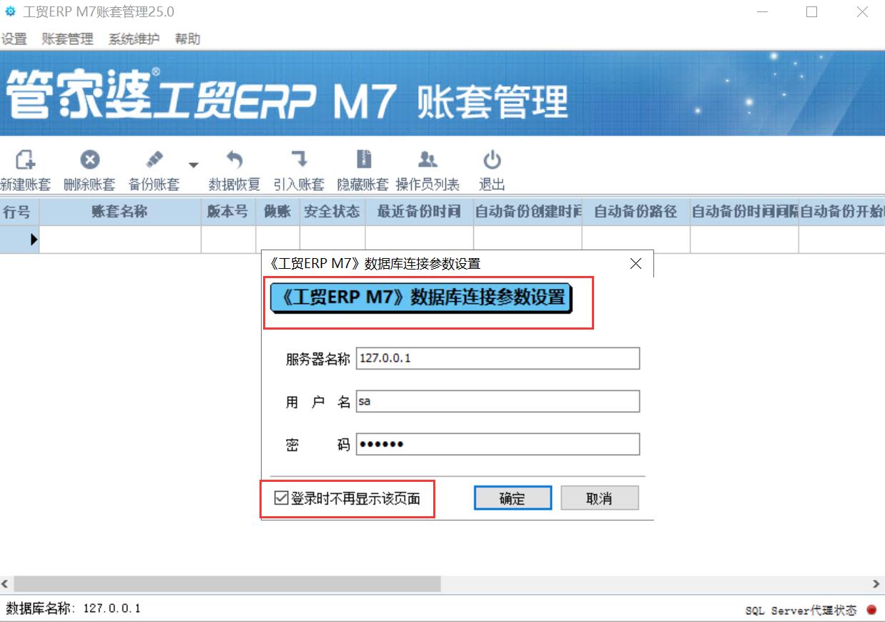 4、稍微一等,三两分钟就会安装完成,也很简单,安装完成后,就会自动启动“管家婆工贸ERP M7账套管理”,根据自己刚才安装的SQL进行填写即可!