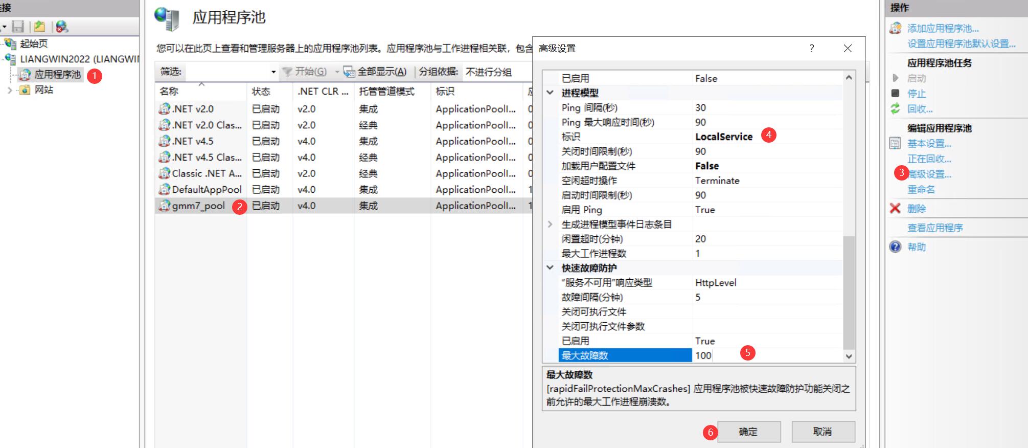 控制面板-管理工具-Internet Information Services (IIS)管理器--应用程序池---gmm7_pool---高级设置---建议“④号标识为LocalService,⑤号最大故障数为100”,确定后重启IIS,不会重启IIS就直接重启电脑即可!