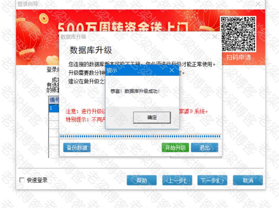 5、管家婆普及Ⅱ TOP单机版升级根据电脑配置来决定快慢,一般一刻钟左右都可以完成,直到提示“恭喜!数据库升级成功!”方可~如下图所示