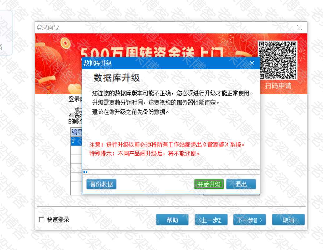 4、然后再次打开管家婆普及Ⅱ TOP单机版,选择刚才恢复的账套直接下一步就会提示数据库升级~~~如下图所示,耐心等待即可!