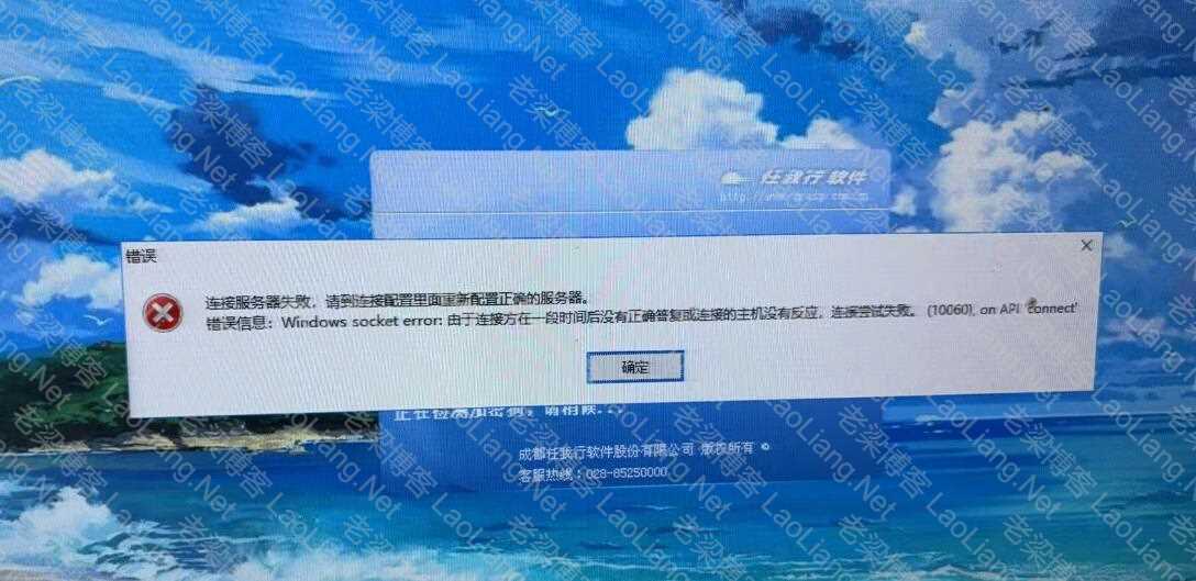 今天网友说她家的管家婆出现了故障,随即丢来一张图,软件为管家婆财贸双全ⅡTop+24.5,错误为“连接服务器失败,请到连接配置里面重新配置正确的服务器。错误信息:Windows socket error: 由于连接方在一段时间后没有正确答复或连接的主机没有反应,连接尝试失效10060,on API'connect'” 如下图所示