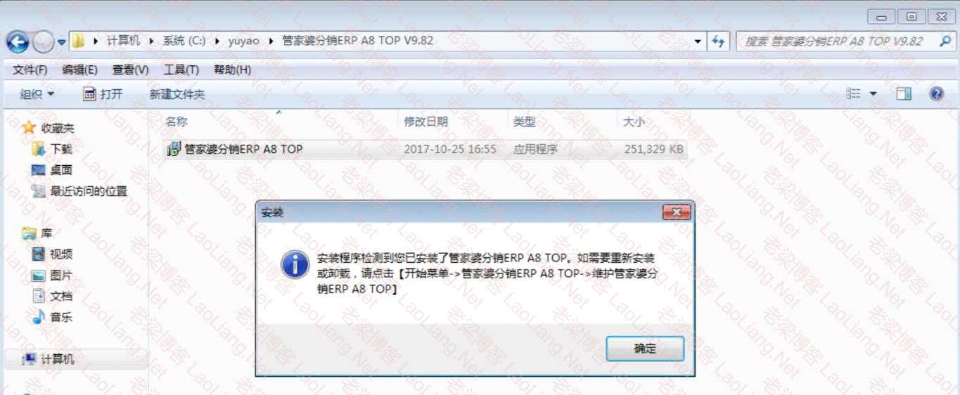 有网友在win7系统下安装管家婆分销ERP A8 TOP9.82版本,安装的时候提示“安装程序检测到您已安装了管家婆分销ERP A8 TOP.如需要重新安装或卸载,请点击[开始菜单->管家婆分销ERP A8 TOP->维护管家婆分销ERP A8 TOP]”如下图所示