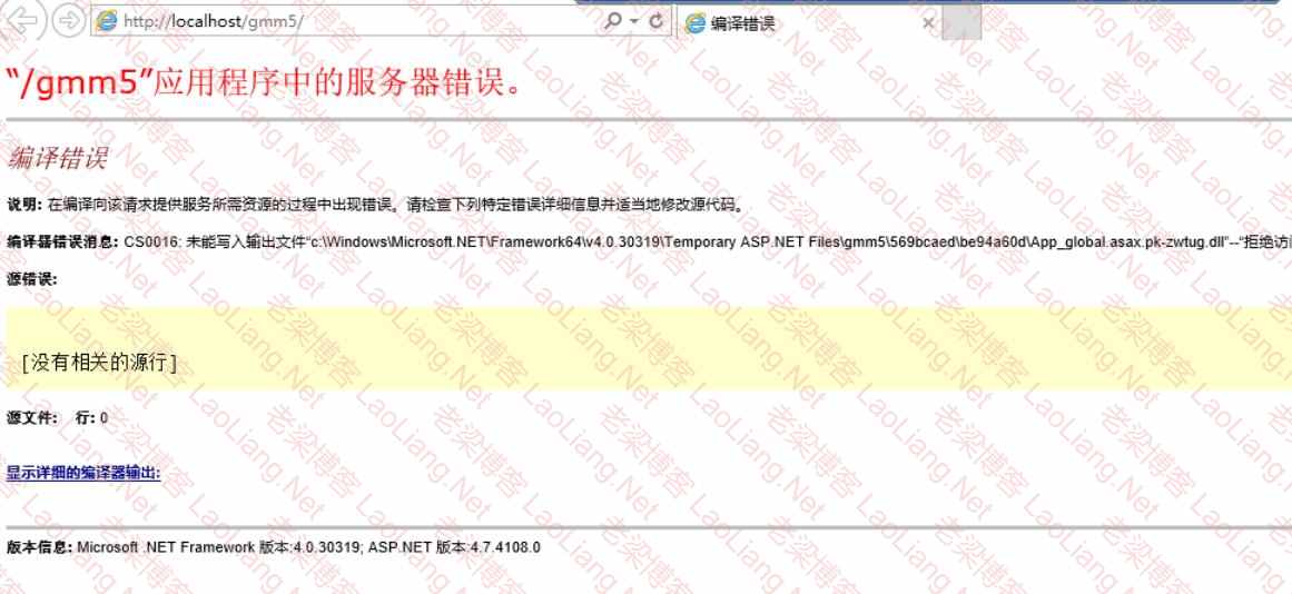 其实出现的啥错误,看文章也好理解“编译器错误消息: CS0016:未能写入输出文件C:\Windows\Microsoft.NET\Framework64\v4.0.30319\Temporary ASP.NET Files\gmm5\569bcaed\be94a60d\App_global.asax .pk-zwtug dll"拒绝访问”,看最后显示的是拒绝访问,那就是权限不够造成的,再往前看路径“C:\Windows\Microsoft.NET\Framework64\v4.0.30319\Temporary ASP.NET Files”,gmm5之前路径有些问题造成的;给予路径权限即可;