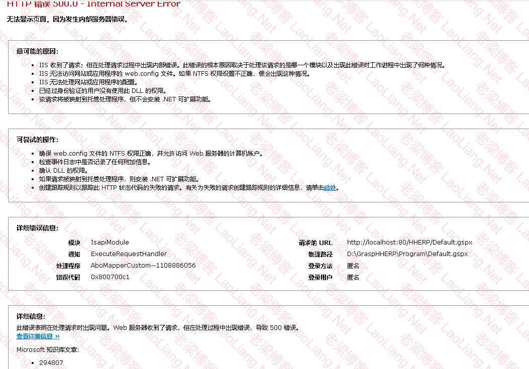 无法显示页面,因为发生内部服务器错误。最可能的原因: