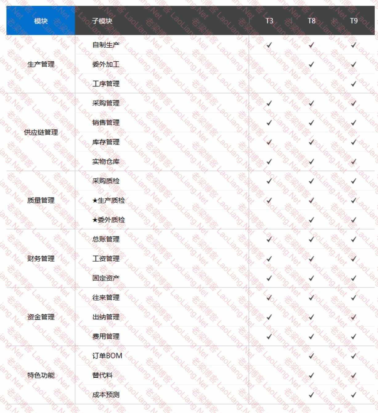 管家婆工贸ERP T系列分“管家婆工贸ERP T3,管家婆工贸ERP T8,管家婆工贸ERP T9”三个版本,可以看一下相关的功能对比图