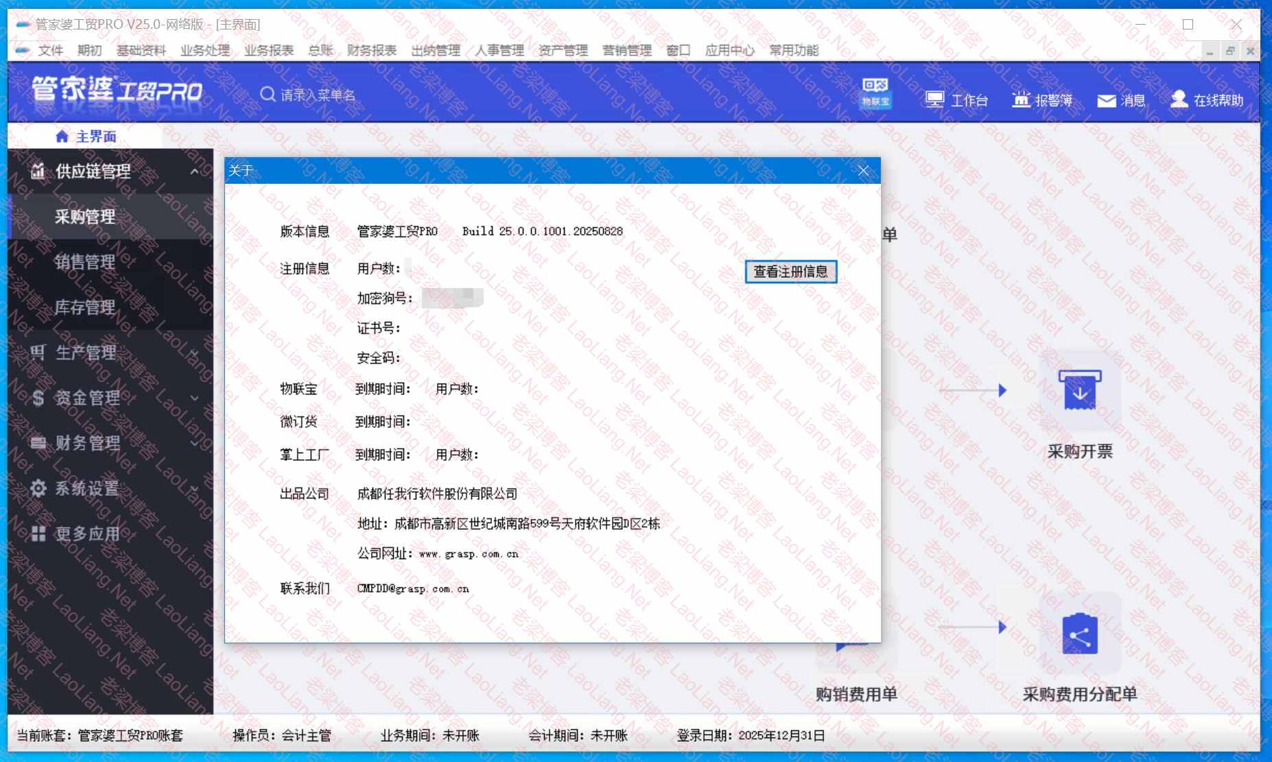 6、登录成功后,就可以正常显示一些相关信息“管家婆工贸PRO Build 25. 0.0.1001.20250828”;