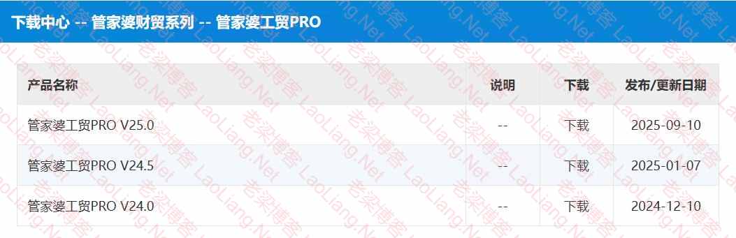 今天看了一下官方,还是跟之前一样,还是只有“管家婆工贸PRO24.0、管家婆工贸PRO24.5、管家婆工贸PRO25.0”三个版本可下载;如下图所示