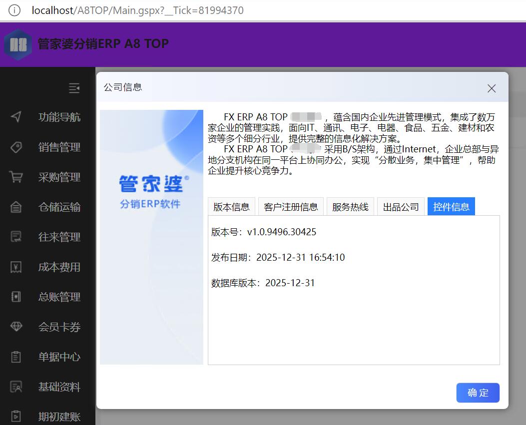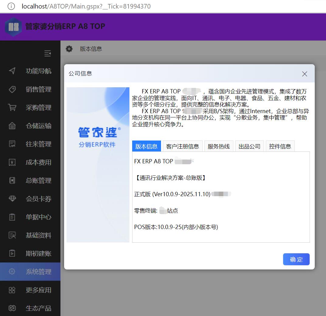 管家婆分销ERP A8 TOP正式版 (Ver10.0.9-2025.11.10)“POS版本:10.0.9-25(内部小版本号) 控件信息版本号:v1.0.9496.30425”