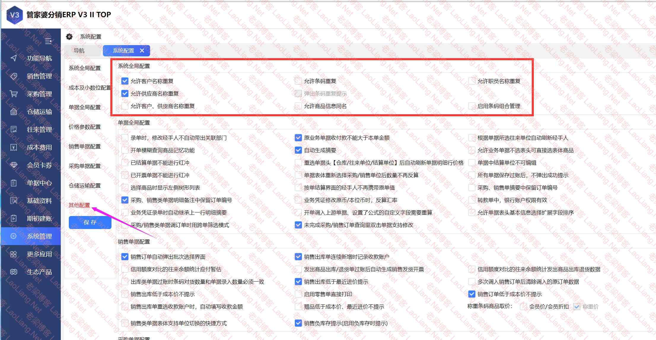 管家婆分销ERP V3 II TOP系统配置里没有其他配置?(您可以进入【系统配置】->【其他配置】中勾选“允许商品信息同名”)
