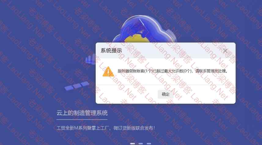 有网友测试管家婆财贸ERP系列中的管家婆财贸ERP C8产品,登录的时候提示“服务器做账账套(1个)已超过最大允许数(0个),请联系管理员处理”,如下图所示