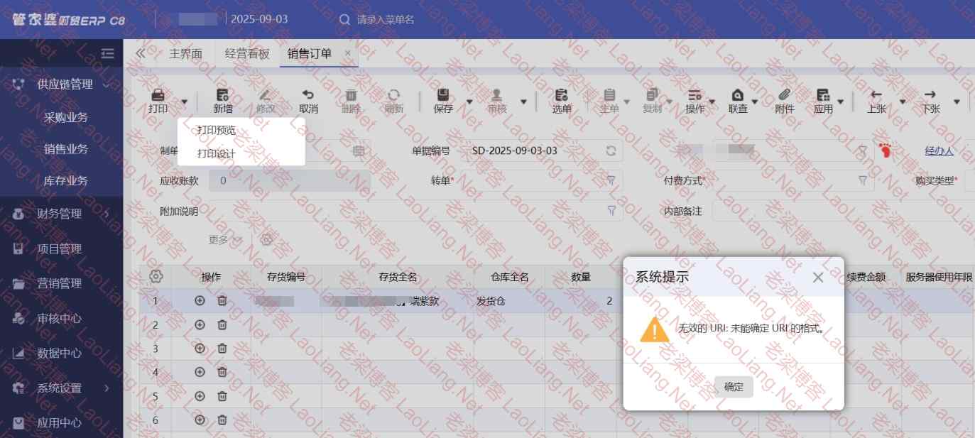 这是2025年9月份有一位成都网友找到我说,他玩的管家婆财贸ERP C9不能启用管家婆web打印,启用后打印订单提示“无效的URL未能确定URL的格式”,如下图所示