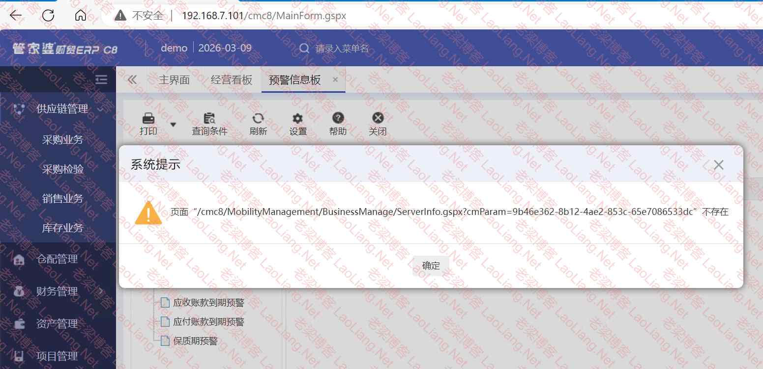 打开管家婆财贸ERP C8某些模块提示“页面“/cmc8/MobilityManagement/BusinessManage/ServerInfo.gspx?cmParam=9b46e362-8b12-4ae2-853c-65e7086533dc”不存在”的说明