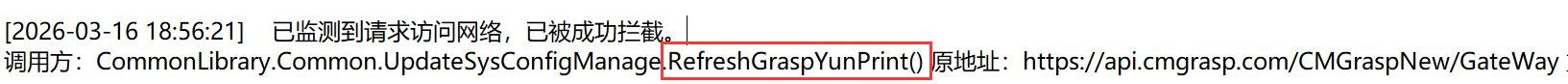 [2026-03-16 18:56:21] 已监测到请求访问网络,已被成功拦截。 调用方:CommonLibrary.Common.UpdateSysConfigManage.RefreshGraspYunPrint() 原地址:https://api.cmgrasp.com/CMGraspNew/GateWay