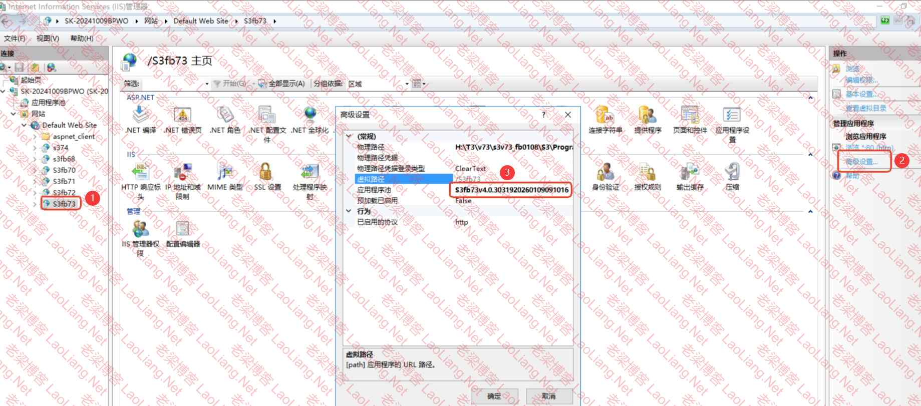 1、打开iis,点击虚拟目录,点击“高级设置”,复制应用程序池的内容,如下图所示