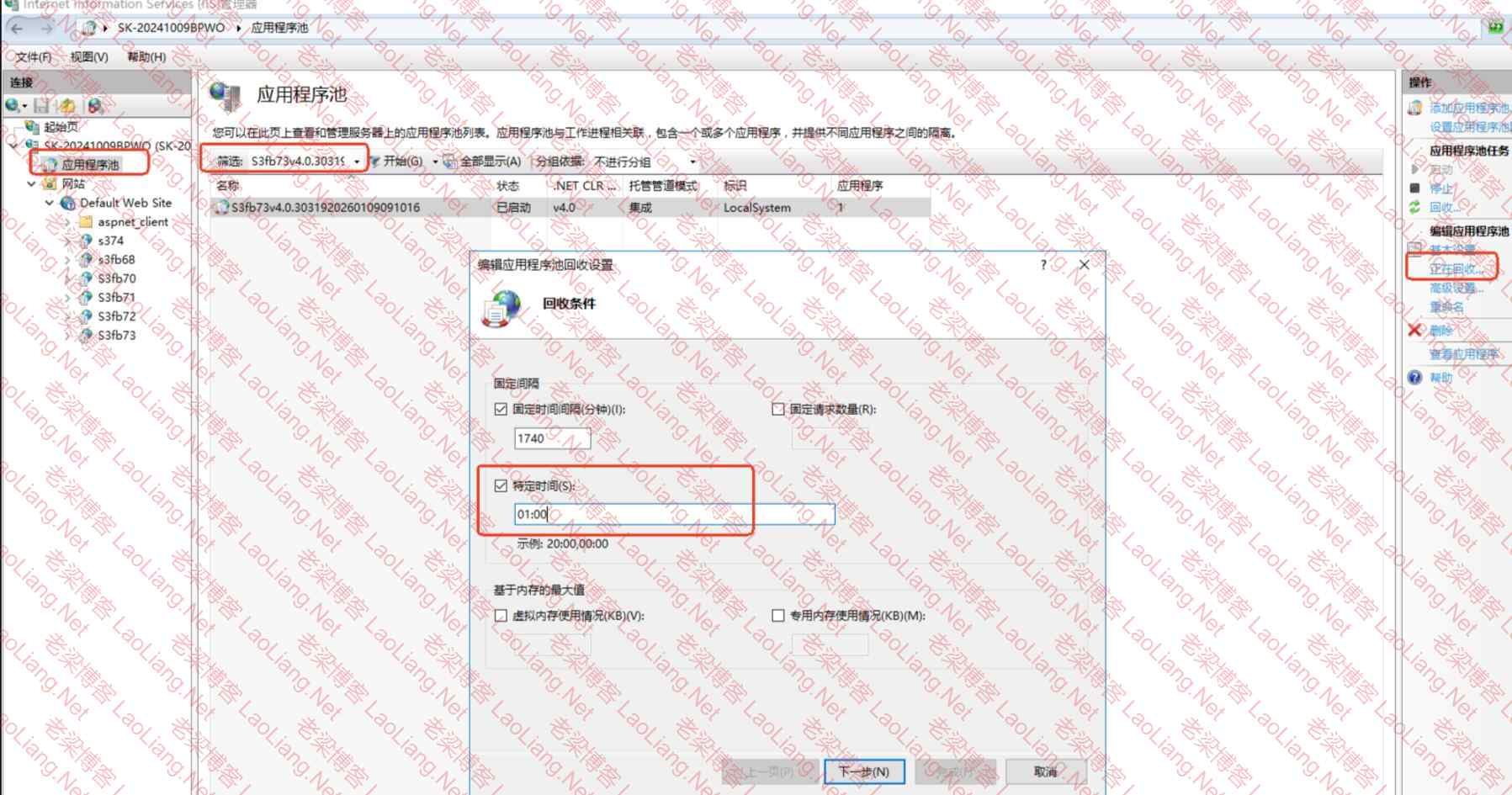 2、点击“应用程序池”,筛选处录入刚才复制的内容回车,点击出现的应用程序池,右边点击“正在回收”,勾选“特定时间”,录入客户不用软件的时间,比如凌晨1点,下一步,完成即可!