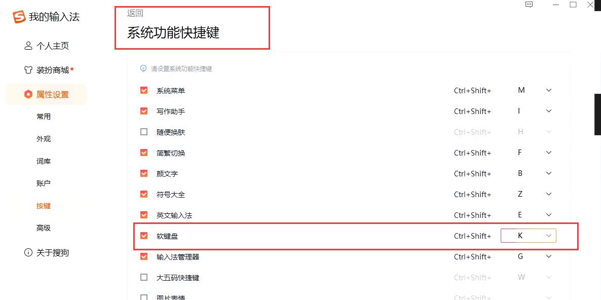 在搜狗输入法--属性设置--系统功能快捷键--往下翻就能看到软键盘的快捷键跟金蝶kis专业版许可证引入快捷键一样,直接把前面的小√去掉即可,如下图所示