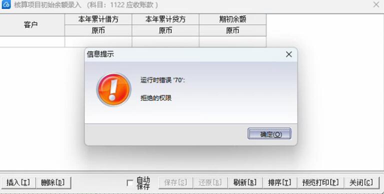今天有网友在群里发了一张图,没判断错的话,应该是金蝶kis专业版,在核算项目界面提示“运行时错误70 拒绝的权限”,如下图所示