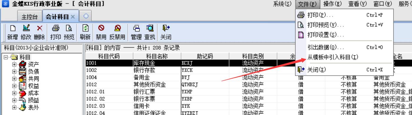 1、基础设置---会计科目---右上角 文件--从模板引入 科目,如下图所示