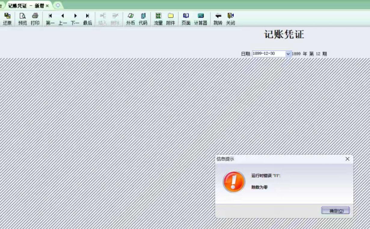 金蝶kis商贸版增加凭证时提示“运行时错误11 除数为零 ”的说明(凭证日期变成1899)
