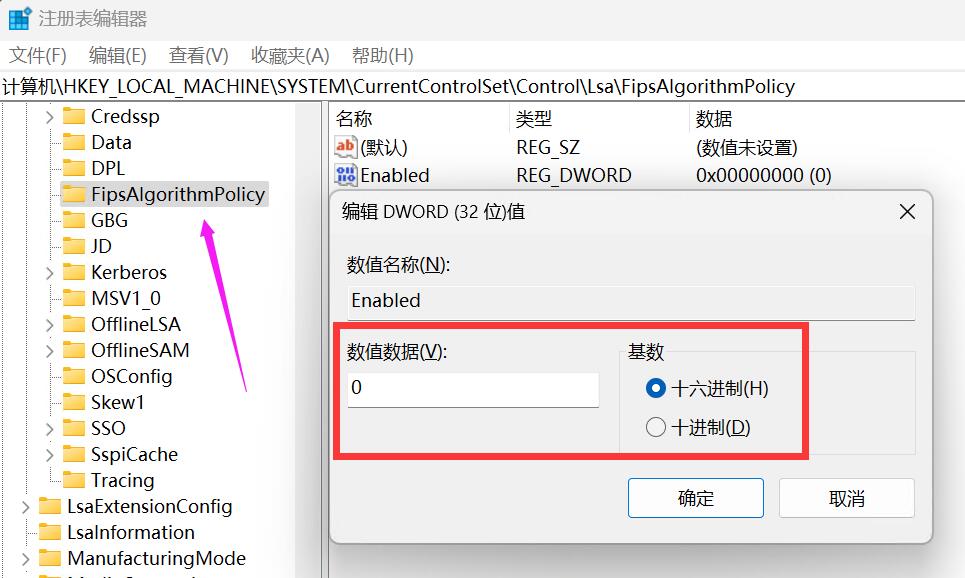 3、点击Lsa项,点击下方跳出的FipsAlgorithmPolicy项,右侧表内出现一个默认项和一个Enabled项,双击Enabled项,把数值数据框中的数据改为0即可