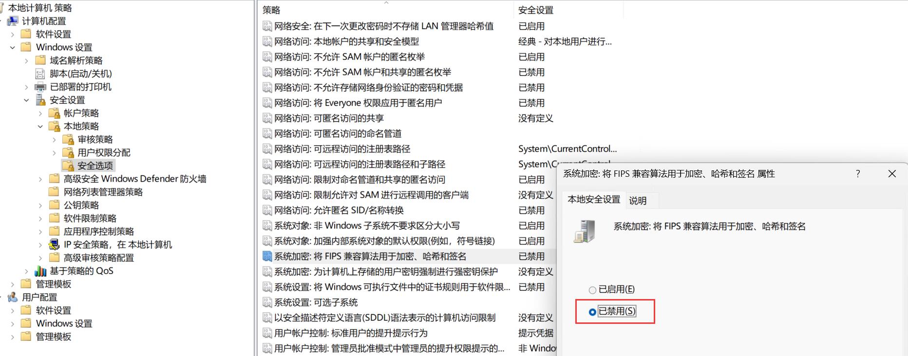 第二种:禁用统加密:将FIPS兼容算法用于加密、哈希和签名