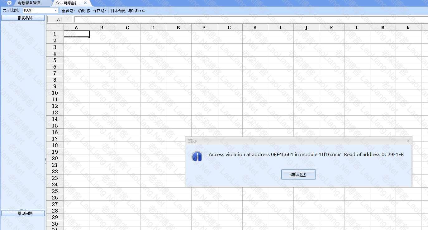昨天有网友闲着没事儿,折腾金蝶KIS财税王迷你版9. 1(编译于2012-04-07),看编译日期就能看出来时间很遥远了,毕竟放在当下2025年11月来说,都快14年的产品了,在Windows 10安装后,测试“金蝶税务管理”里面企业月度会计,显示“Access violation at address 0BF4C661 in module 'TTF16.ocx'. Read of address 0C29F1EB”如下图所示
