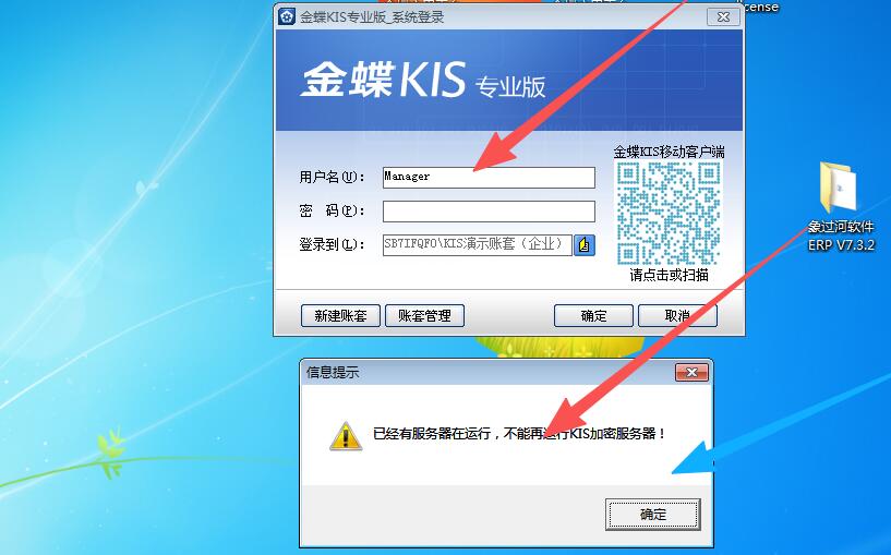 今天有网友在windows 7系统中测试金蝶kis专业版12.3版本,打开客户端就提示“已经有服务器在运行,不能再运行kis加密服务器!”,如下图所示
