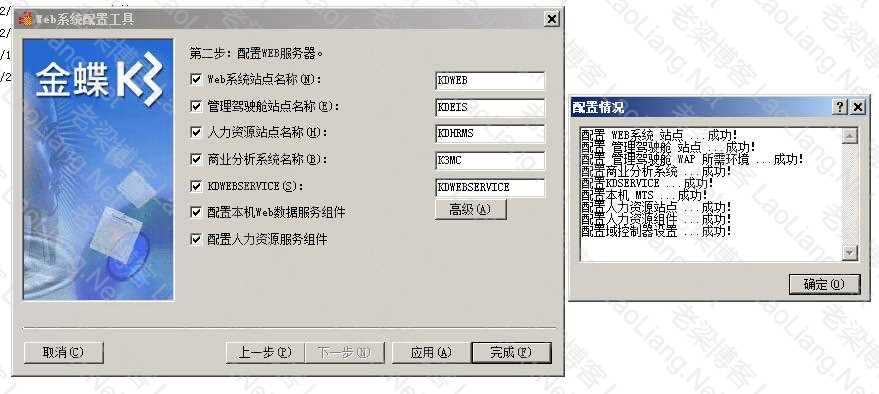 3、安装完中间层组件,就会继续安装“WEB系统配置工具”,直接点击应用,下一步即可,直到出现全部的成功,方可是正常,如下图所示!