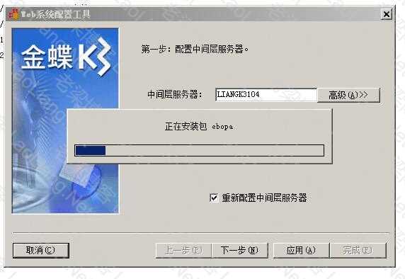 1、安装完,就会自动出现“配置中间层服务器”如下图所示,点击右上角的确定,再点一下应用,再点下一步即可,如下图所示