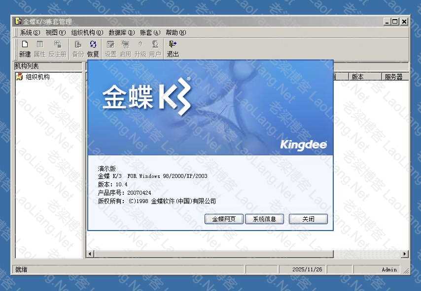 4、然后登录账套,以及在系统管理账套内都可以看到版本信息,这就是一切正常了!产品序号: 20070424;