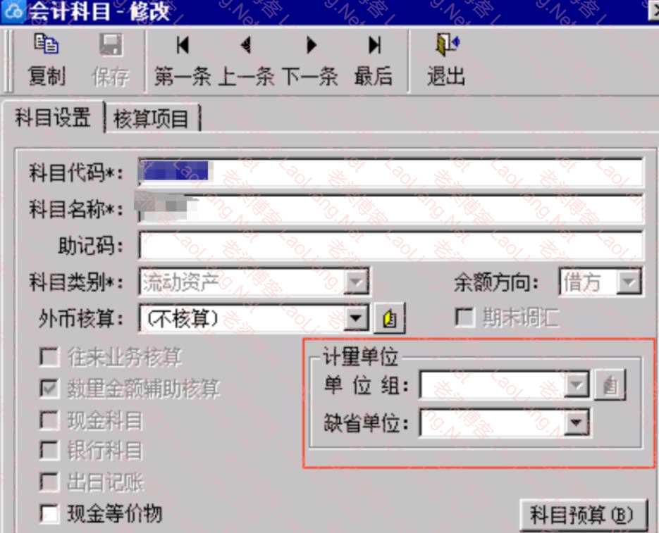 有网友在金蝶kis专业版16.0科目勾选了数量金额辅助核算,但是计量单位组和计量单位为空。如下图所示: