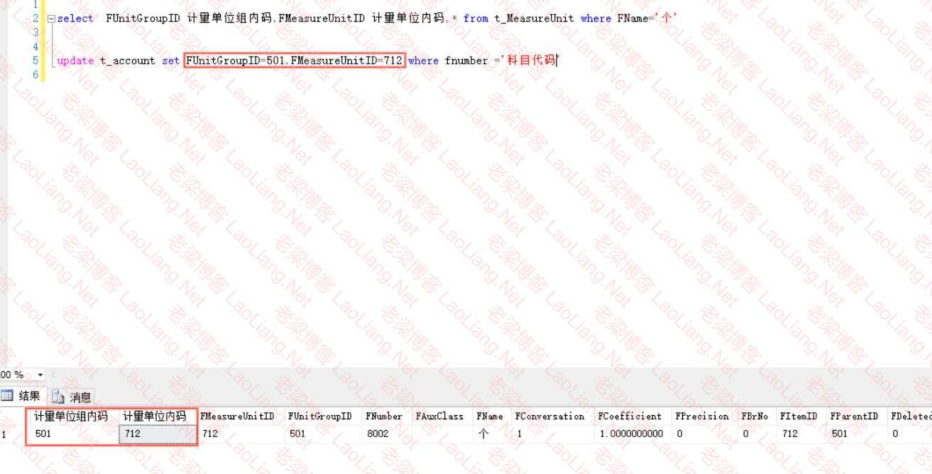 2、通过以上语句查询到计量单位组内码为501,计量单位内码为712,再通过以下语句更新科目的计量单位内码即可。
