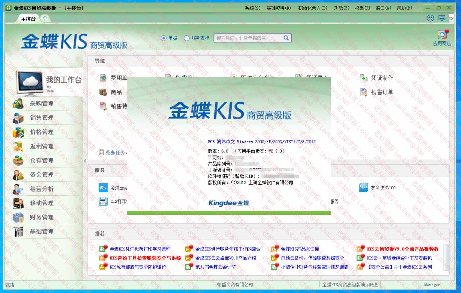 安装完之后显示“版本: 金蝶KIS商贸版6.0 (应用平台版本: V2.2.0)”,如下图所示