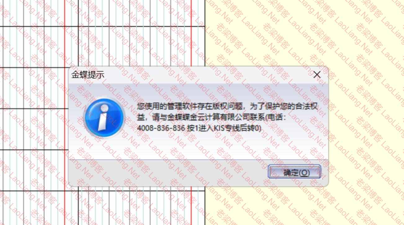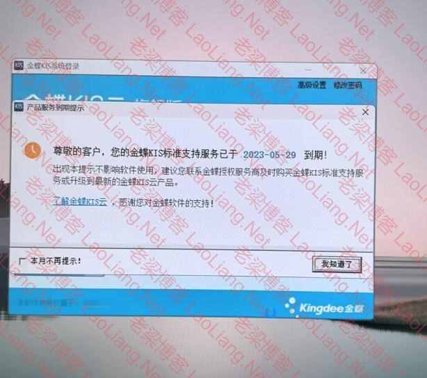 打开金蝶KIS云旗舰版7.0提示“您的金蝶kis标准支持服务已到期;您使用的管理软件存在版权问题,为了保护您的合法权益,请与金媒蝶金云计算有限公司联系”的说明