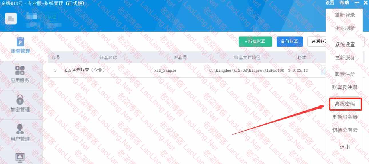 说明:只能等到有网络的时候,先登录金蝶KIS云专业版-系统管理,然后在“设置”菜单下面设置离线密码即可。