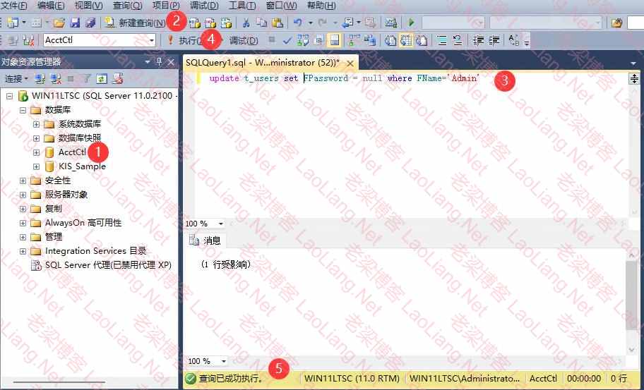 3、用SQL语句干掉,需要进入数据库客户端,然后打开AcctCtl公共账套,然后执行下列语句,清除密码即可!