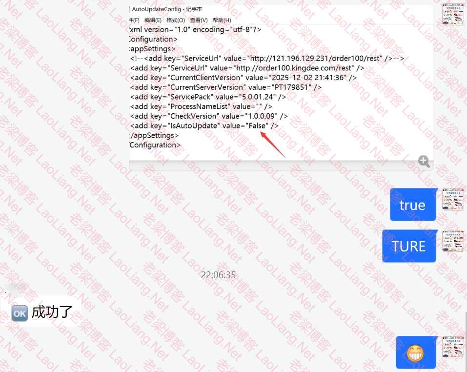 3、将<add key="IsAutoUpdate"value=False">中的false改成Ture后保存,再以管理员身份运行安装补丁即可,如下图所示,这不网友就成功了嘛~~~