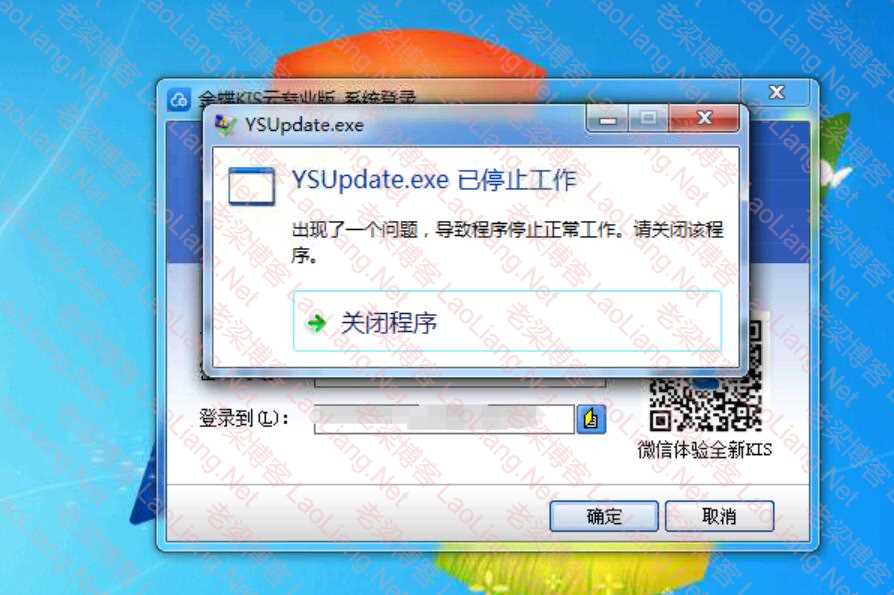 昨天有网友说,他客户电脑Win7旗舰版,金蝶kis专业版15.0,客户端电脑,服务器电脑正常,安装完之后,登录就提示“YSUpdate.exe已停止工作”,关闭程序之后可以正常进入账套,重新覆盖安装过,数据保护也调整过,兼容性、管理员权限设置了还是提示“YSUpdate.exe已停止工作”,如下图所示,问有没有什么方向排查一下