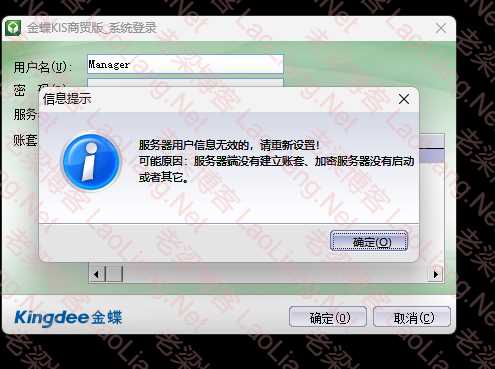 昨天晚上给一湖北的客户处理金蝶KIS商贸版8.0的东西,然后数据库一切正常的时候,想起来金蝶是有自己独立账户的,并不是用sa账户的,然而就出现了无法找到服务器“服务器用户信息无效的请重新设置!”的样子,如下图所示