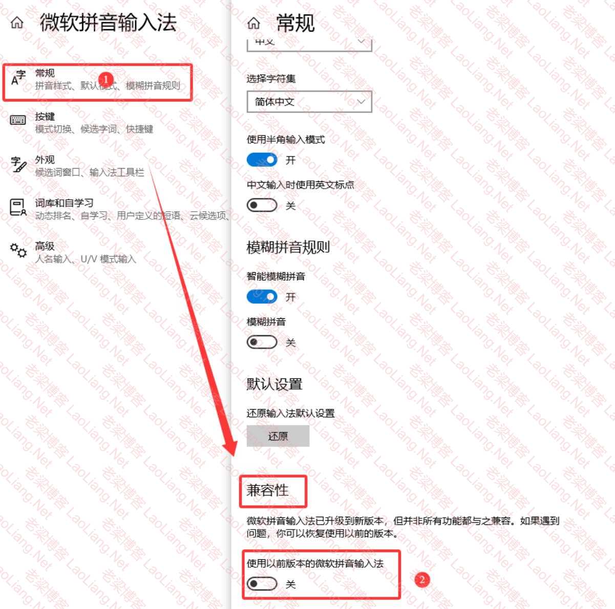 2、打开"微软拼音输入法"设置界面,点击【常规】-【兼容性】-关闭【使用以前版本的微软拼音输入法】,如下图所示