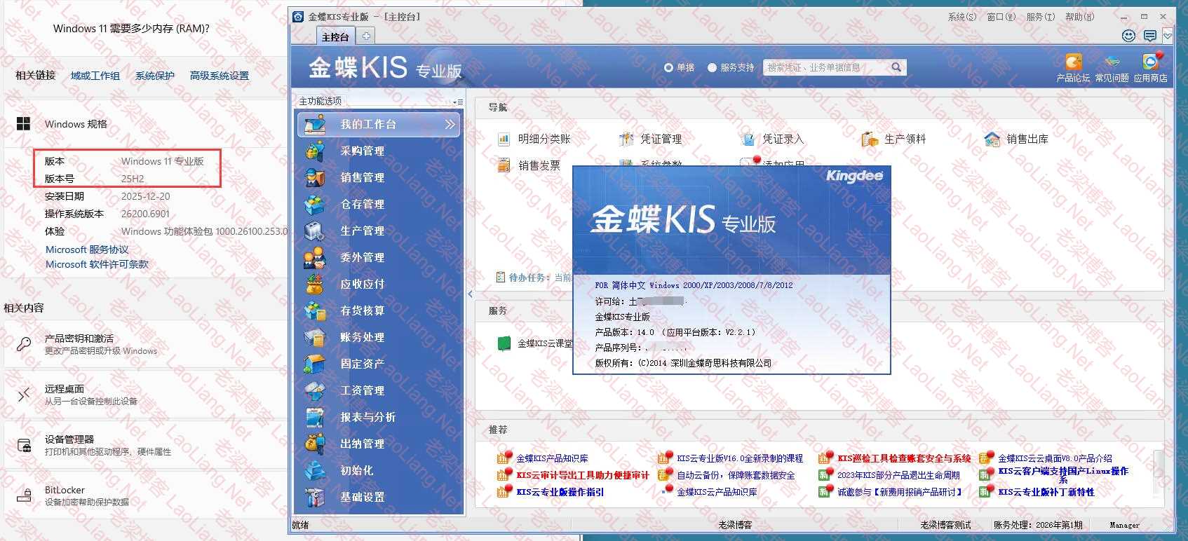 值得推荐财务人员得力助手“金蝶kis专业版14.0” 在Windows 11 25H2下依然稳定运行