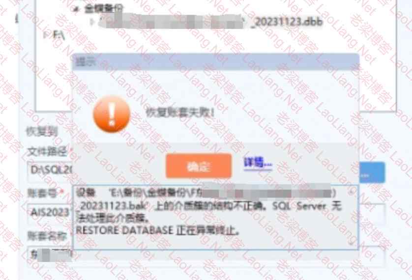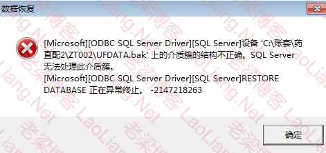 意在交流学习,欢迎赞赏评论,如有谬误,请联系指正;转载请注明出处: » 金蝶或用友恢复账套提示“介质簇的结构不正确SQL Server 无法处理此介质簇;RESTORE DATABASE 正在异常终止-2147218263”的说明