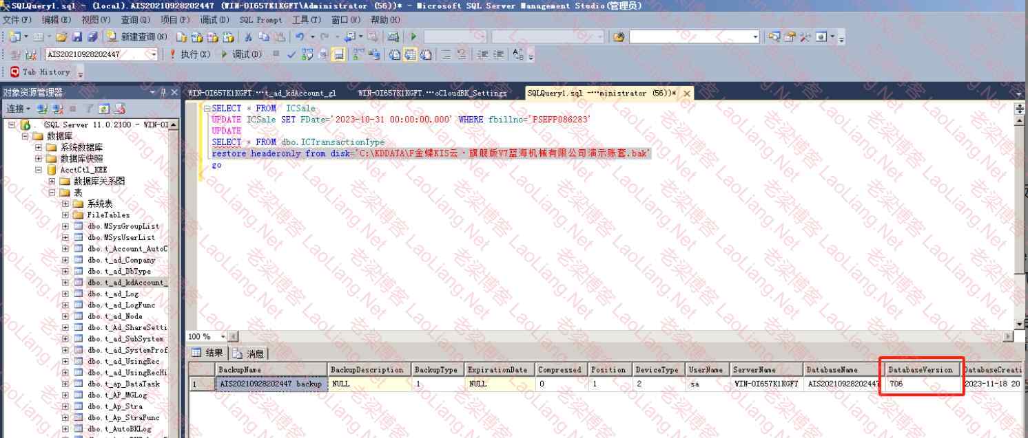 语句如下:restore headeronly from disk='C:\KDDATA\F金蝶KIS云·旗舰版V7蓝海机械有限公司演示账套.bak'