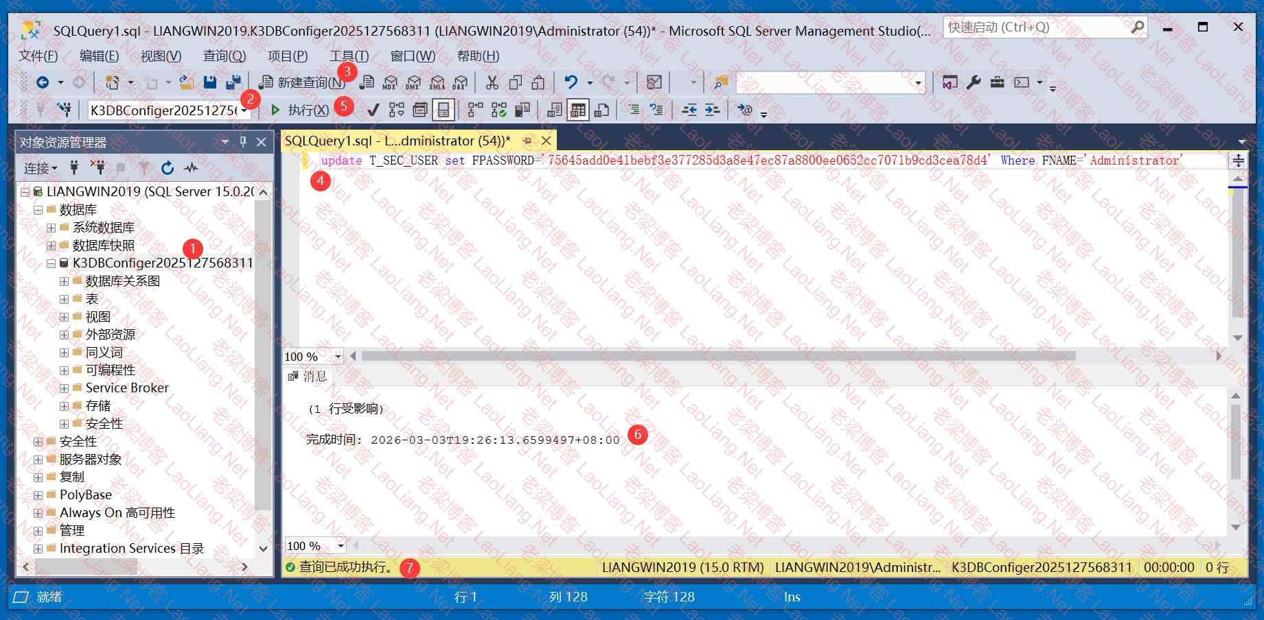 1、登录数据库服务器,打开SQL Server Management Studio,选择管理中心对应的数据库(名称形如K3DBConfiger)新建查询执行以下语句,如下图所示