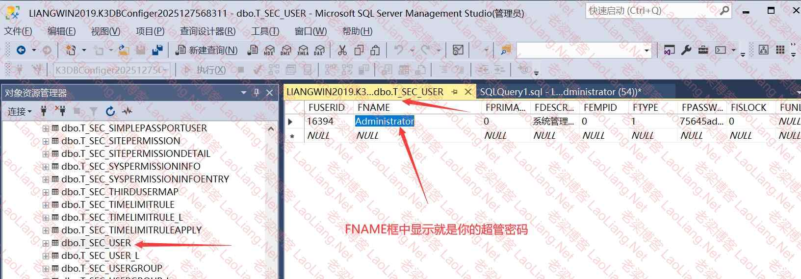 打开SQL Server Management Studio,选择管理中心对应的数据库(名称形如K3DBConfiger),找到“T_SEC_USER”,右键--编辑前200行---找到“FNAME”就会显示你的用户,如下图所示
