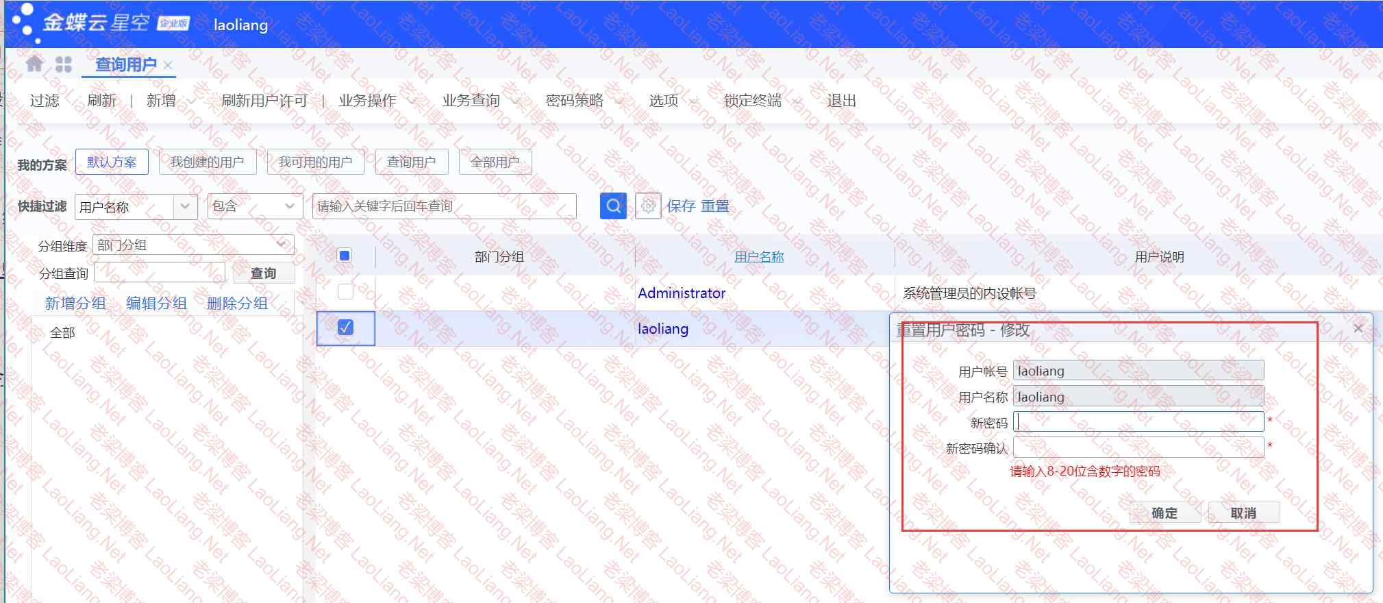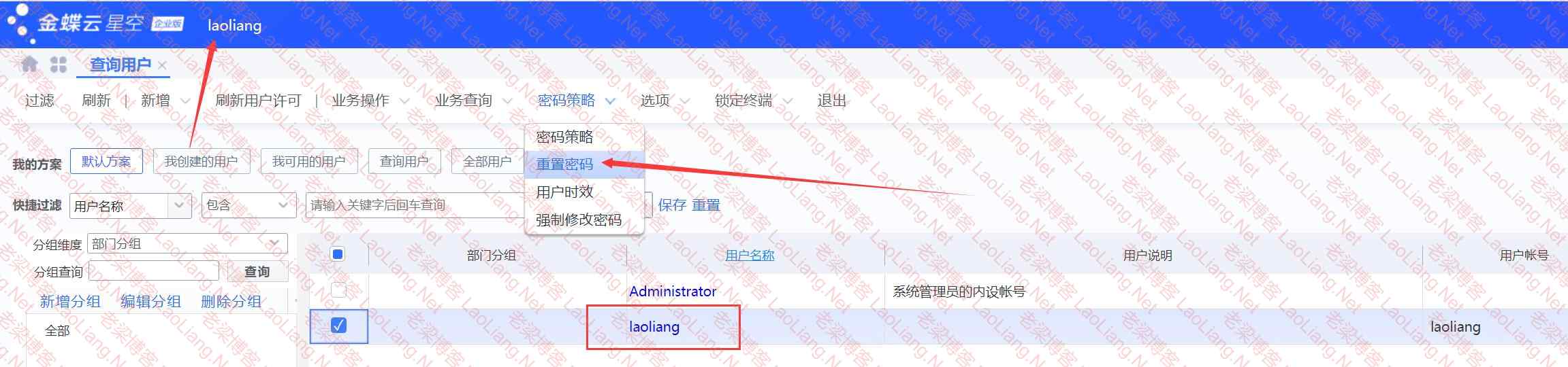 3、登录成功后,右上角搜索,输入查询用户,即可直接抵达战场,下面勾选自己所要修改账户,点击密码策略---重置密码,如下图所示,此刻图解为laoliang的用户,当然,账套我也选择的laoliang,仅此作为教程;