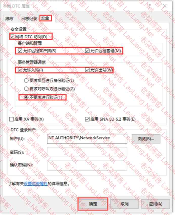 打开运行,输入“Dcomcnfg”打开组件服务;(或者控制面板-管理工具-组件服务打开)---展开“组件服务”-“计算机”-“我的电脑”-“Distributed Transaction Coordinator”-“本地DTC”,右键选择“属性”----切换到“安全”选项卡,勾选“网络DTC访问”、“允许远程客户端”、“允许远程管理”、“允许入站”、“允许出站”、“不要求进行验证”,确定保存即可。如下图所示
