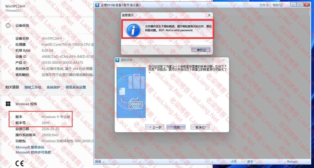 这几天大家都在说金蝶kis标准版在Windows 11 25H2系统中打开账套没问题,就是新建账套到最后,就提示“文件操作发生下面的错误,请仔细检查有关的文件、路径和驱动器。3031: Not a valid password.”如下图所示